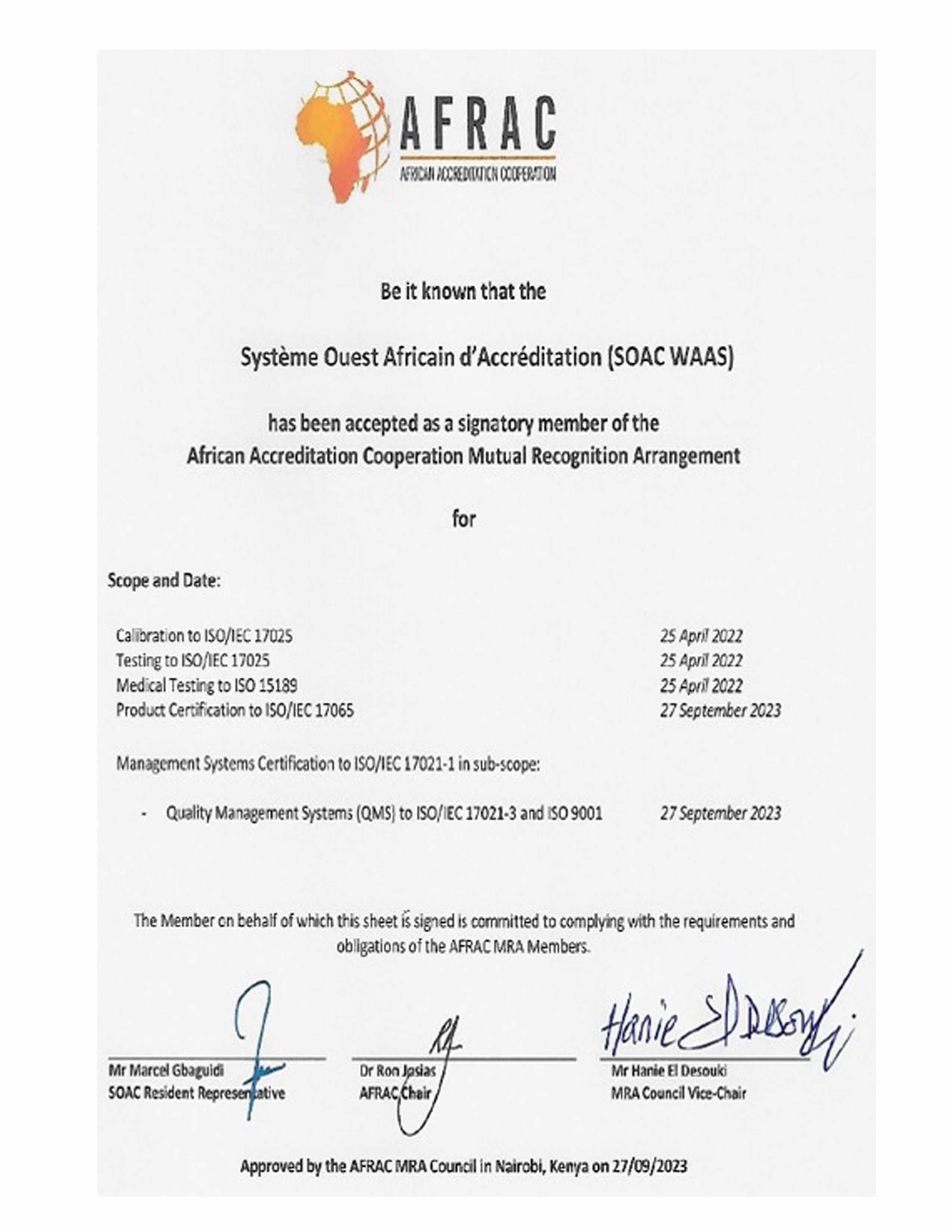 L’accréditation SOAC est une garantie pour la reconnaissance internationale des résultats d’évaluation de la conformité et facilite l’accès aux marchés des produits et services, au niveau national, régional et international. Cette reconnaissance internationale du SOAC est soutenue grâce aux accords multilatéraux de AFRAC, ILAC et IAF dont le SOAC est signataire.
